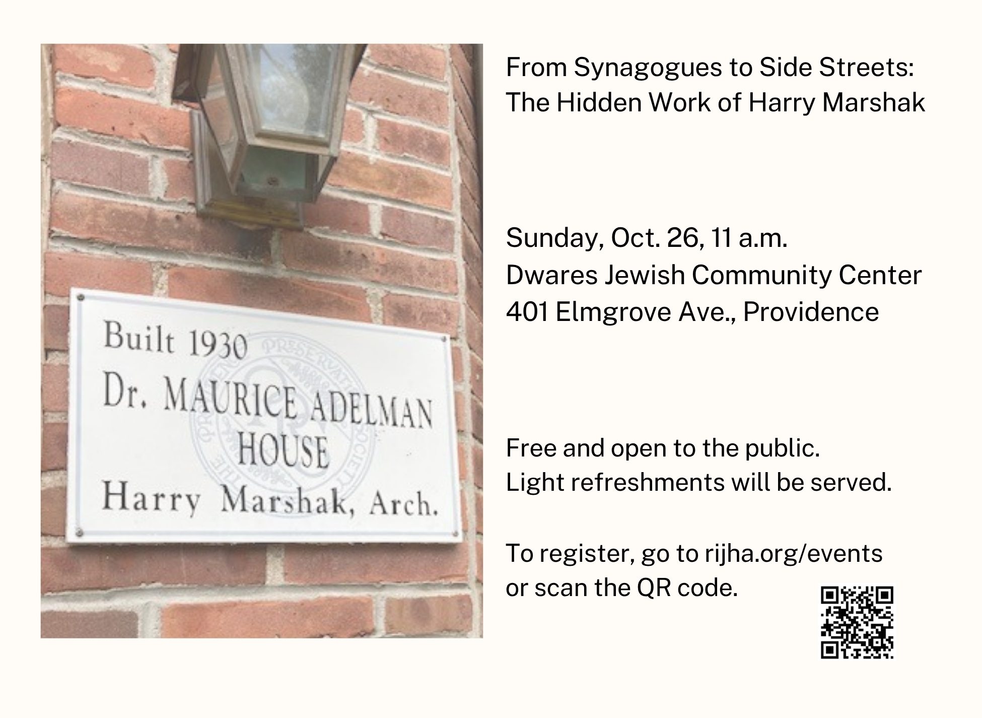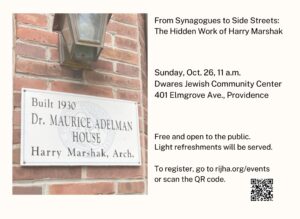 The Rhode Island Jewish Historical Association presents a lecture and slideshow about Jewish architect Harry Marshak, led by Ruth Briendel. Marshak designed wildly different buildings in Providence — synagogues, houses and an apartment building — from the early 1920s to the 1960s. His clients were upwardly mobile Jewish individuals who sought to make their mark on the East Side.